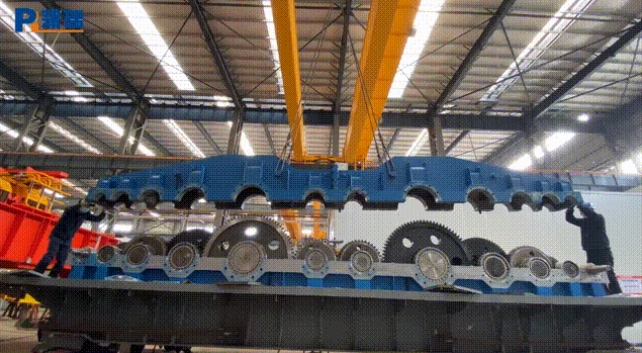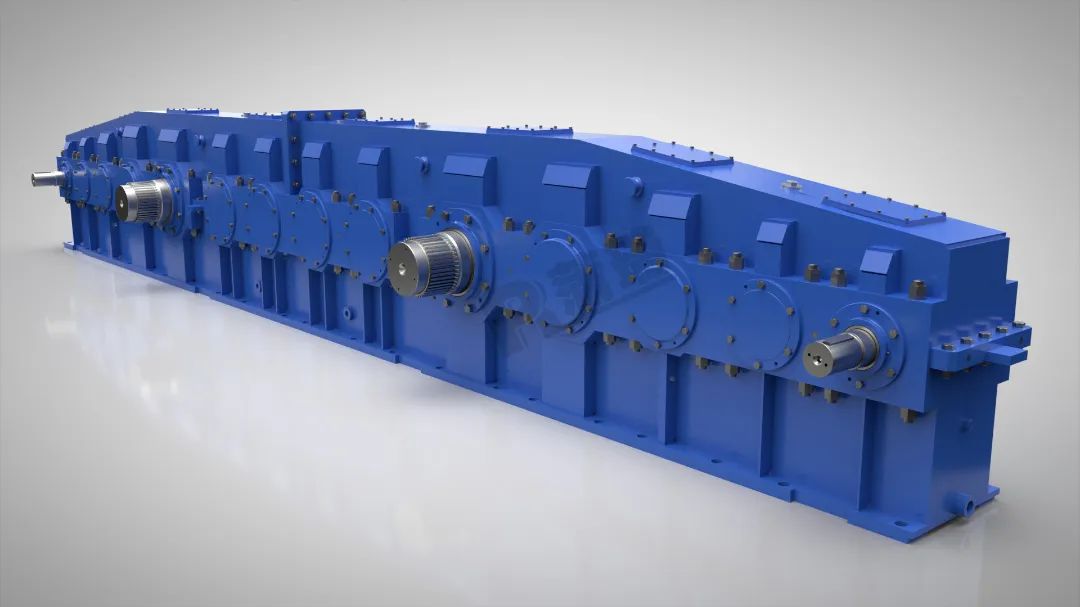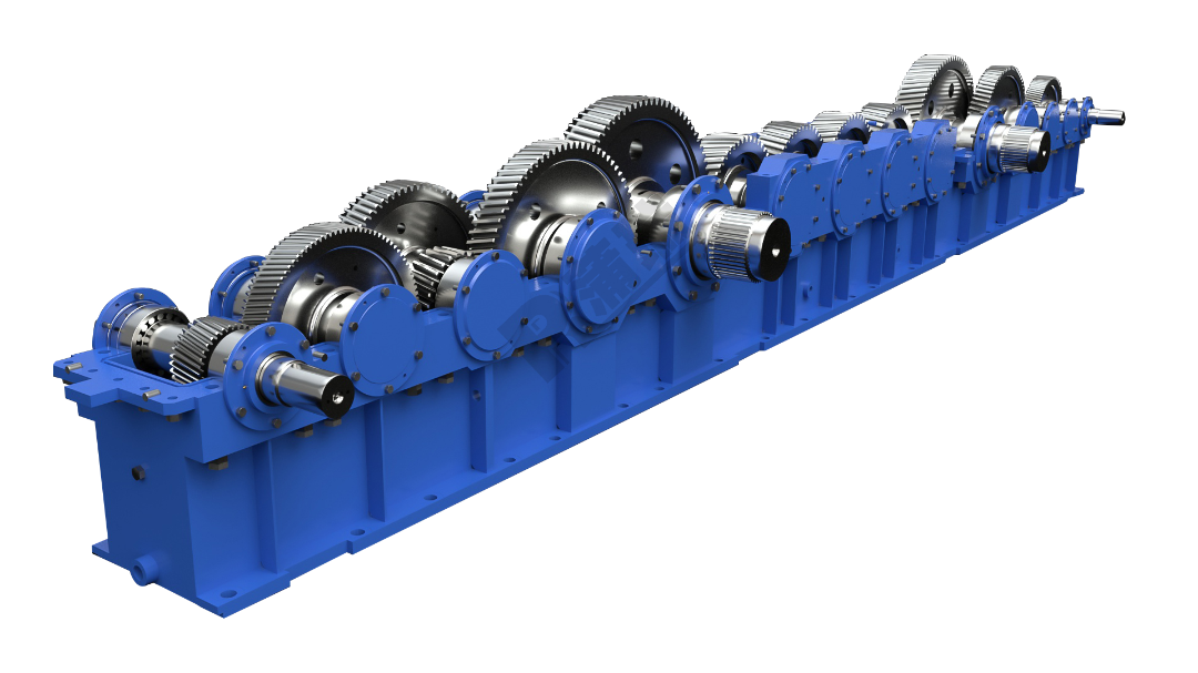 01 大型冶金起重机用一字型减速机采用双输入双输出的对称布置结构,多级传动,严格同步运行,具有防反转功能。