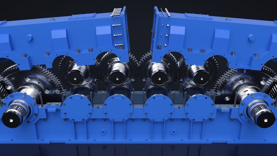 Double-input and output structure with synchronous output, forced lubrication, balanced load, high load capacity, and strong impact resistance.